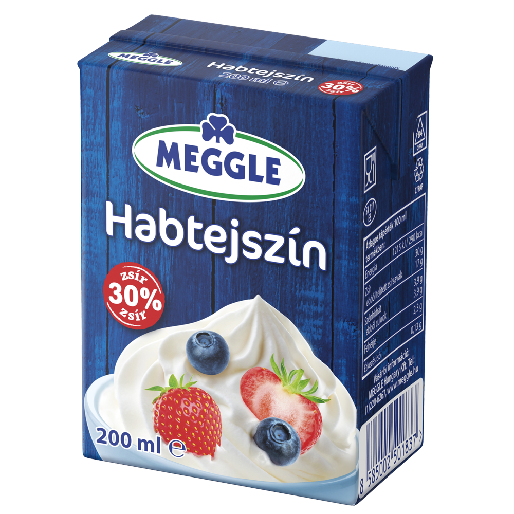 A MEGGLE habtejszín egy igazi klasszikus a konyhában. 30%-os zsírtartalma pompás, tejszínes friss ízt garantál. Felveréskor térfogata a duplájára nő, még citromlé hozzáadása mellett is. Minden desszertnek, krémnek és habnak sokkal krémesebb, tejszínesebb ízt kölcsönöz, emellett tökéletes állagot biztosít. Felhasználás előtt hűtsük le a tökéletes végeredmény érdekében.
